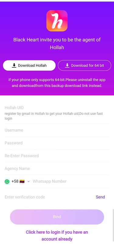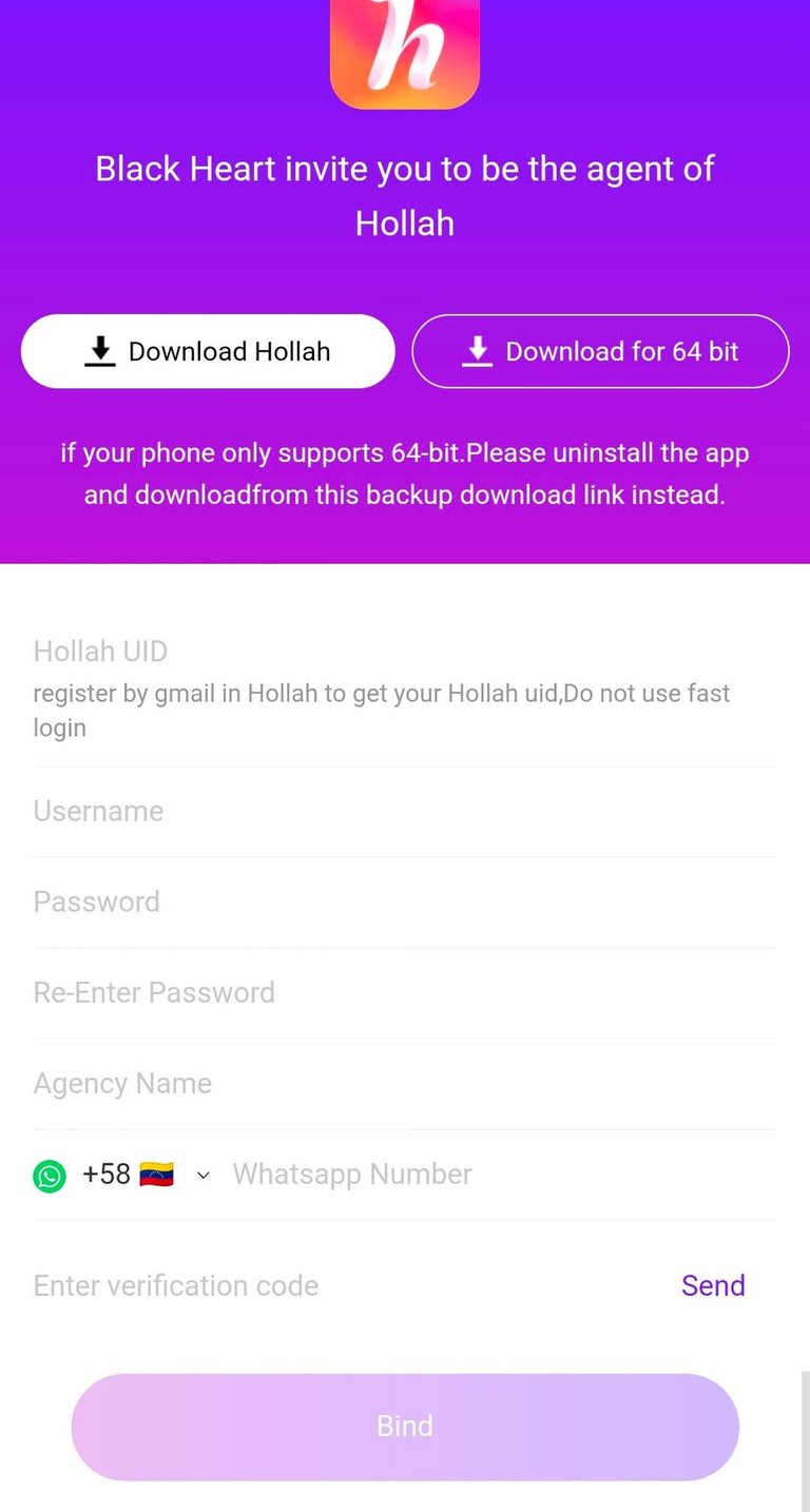 Hollah UID: Enter the UID you obtained from registering via Gmail within the Hollah app.